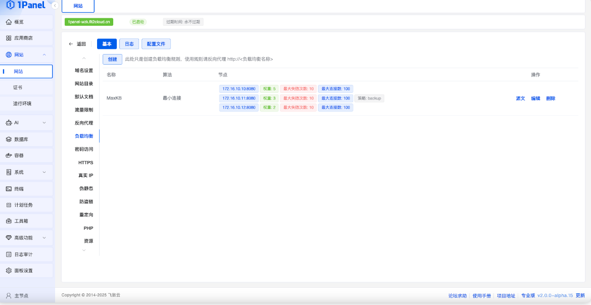 新增网站负载均衡功能,支持自定义转发策略、健康检查与故障自动切换。提升网站的高可用性与访问稳定性,满足多场景业务部署需求。