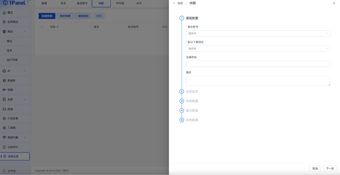 支持为 1Panel 主节点创建系统快照,便于在需要时快速回滚至指定历史版本。可自定义快照内容,灵活满足不同备份需求。主节点发生故障时,可通过快照实现一键恢复,保障系统稳定运行。