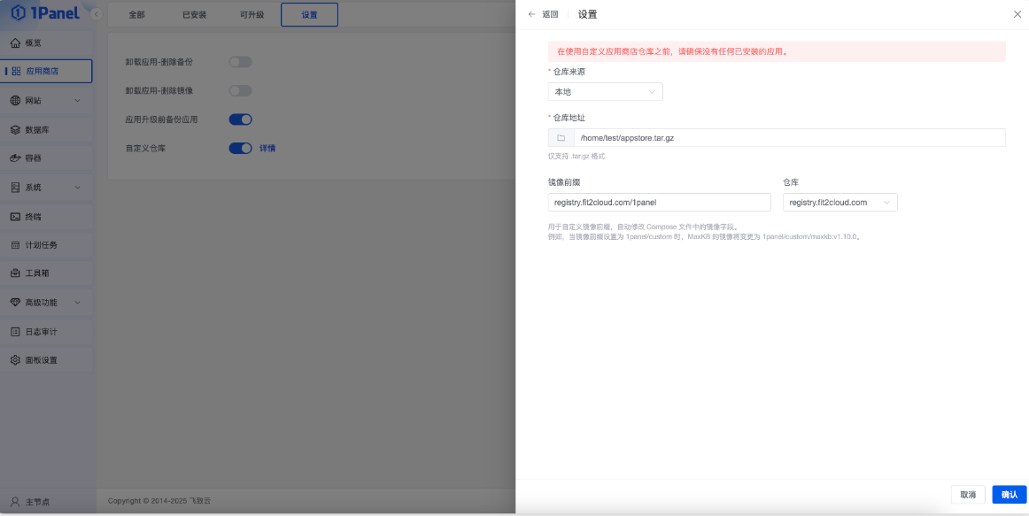 与此同时,应用商店新增支持了自定义仓库。现在,你可以通过 1Panel 打造自己的专属软件库了。