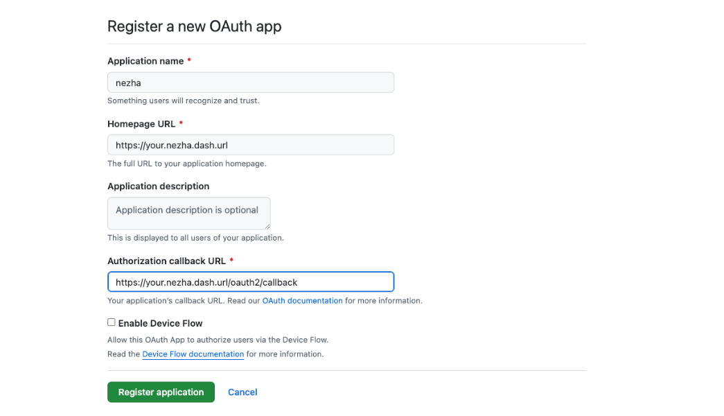 • Authorization callback URL - 填写回调地址,如:"http://dashboard.example.com/oauth2/callback"(不要忘记 /oauth2/callback)。