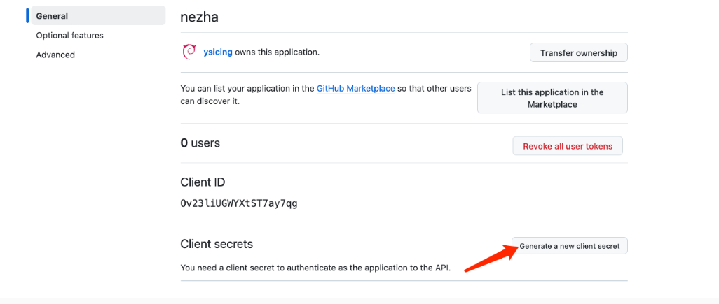 保存页面中的 Client ID,然后点击 “Generate a new client secret“,创建一个新的 Client Secret,新建的密钥仅会显示一次,请妥善保存。