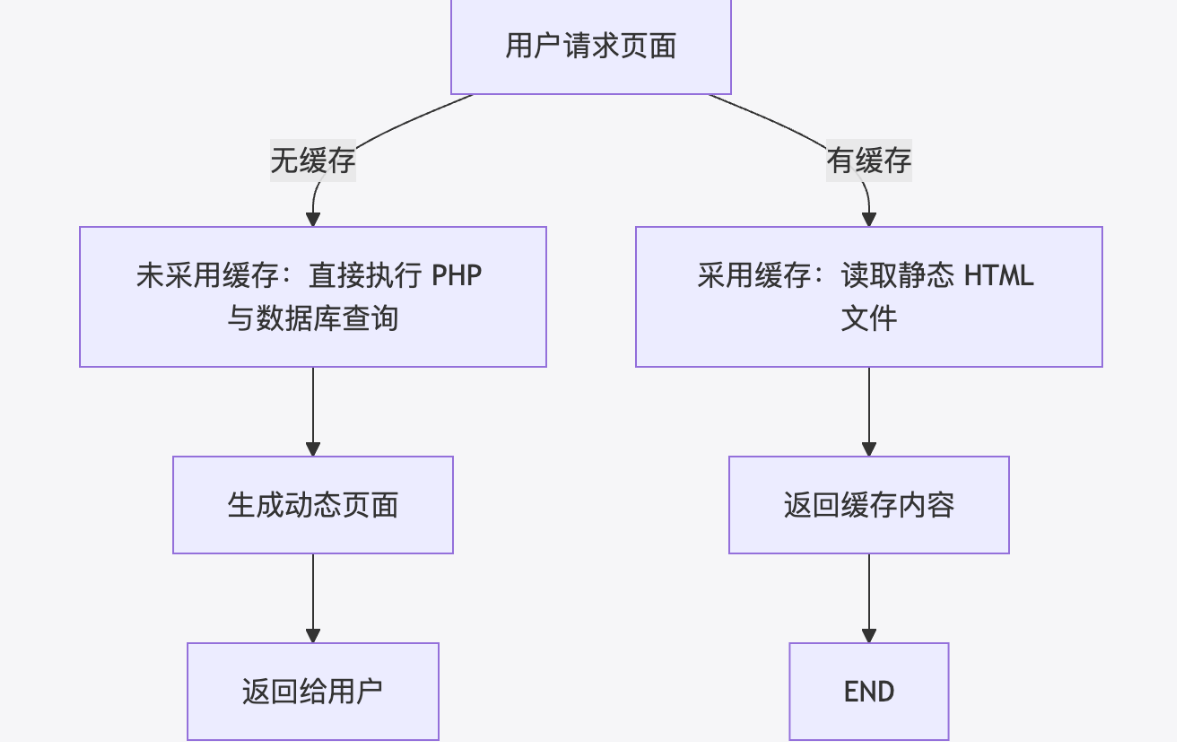 上述流程图直观展示了,采用缓存后网站能直接返回预生成的静态页面,避免了繁重的实时计算,从而达到快速响应用户请求的效果。