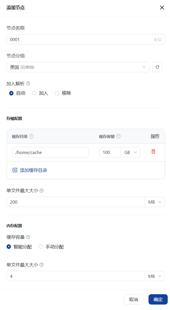 节点的名称可以更具自己的需求和喜好去设置,节点的分组可以更具你配置节点的属性去配置是边缘组还是上游组。博主还是只分享一个节点的配置,其他节点的配置方法是一样的。存储目录可以随便设置也可以更具你设置的目录储存。存储容量更具你服务器的内存或者是你的磁盘大小设定。其他的就可以不用更改了,用系统默认的就可以了。如下图: