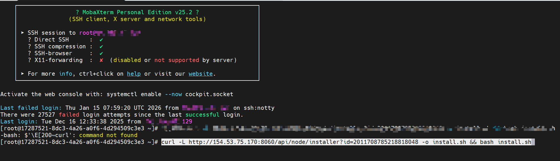 7、通过SSH链接上你要安装节点的服务器,粘贴安装命令。如下图: