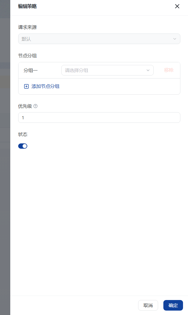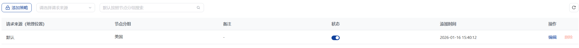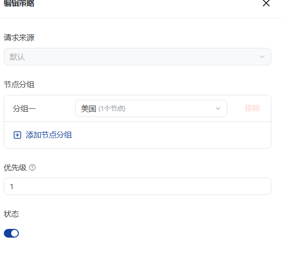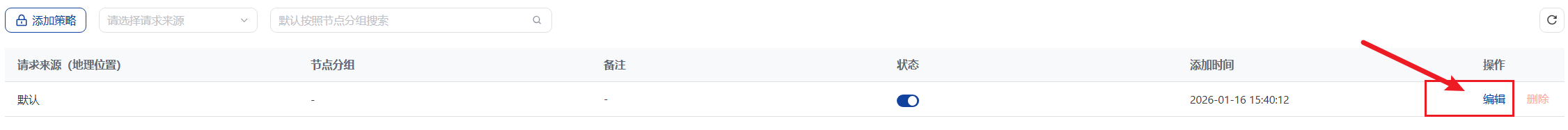 6、节点分组根据你的需求选择,根据你的需求可以选择边缘组或者上游组。为了负载均衡你也可以添加对各节点分组。冲突仲裁机制。当一个用户请求同时匹配多条策略时(例如同时匹配“美国”和“英国”),系统优先执行数值较小的策略。博主这边只设置了一个边缘分组就只配置一个。如下图: