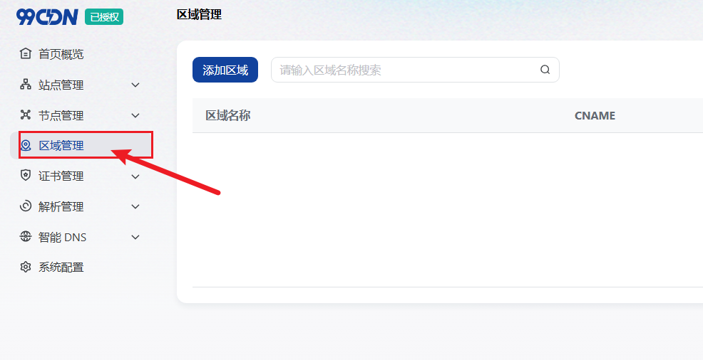 1、登录99CDN控制面板,点击区域管理。如下图: