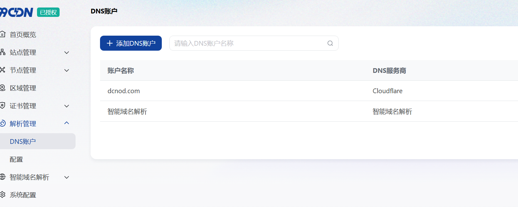 博主这边接入域名和转换域名配置的同一个域名,如要配置两个不同的域名就要在DNS账户中添加对应域名的账户。转换域名的添加和接入域名的步骤是一样的,这里就不再重复步骤了。如下图所示就表示域名以及配置完成了: