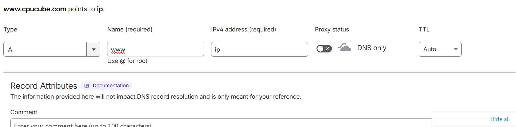 首先我们要添加两个节点,一个是你的域名,一个是www。这样设置你不管是用域名和www都可以访问你的网站。这两个节点的Type都不变,Name分别填域名和www,IPV4都填你的IP。