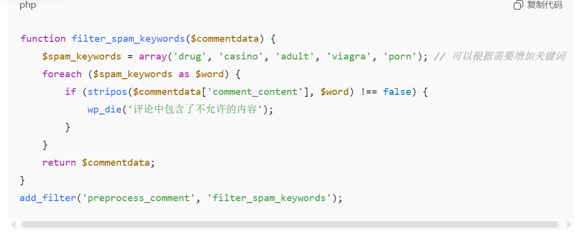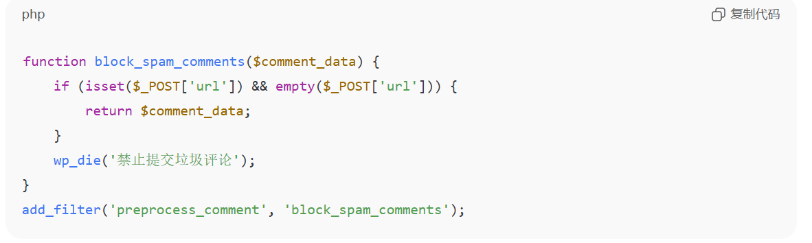 你提到的“几行代码”的防垃圾评论方法,听起来很有用。对于WordPress网站,如果你不想依赖一些插件,又想保持网站性能,可以通过在主题的functions.php文件中简单的代码进行防垃圾。
