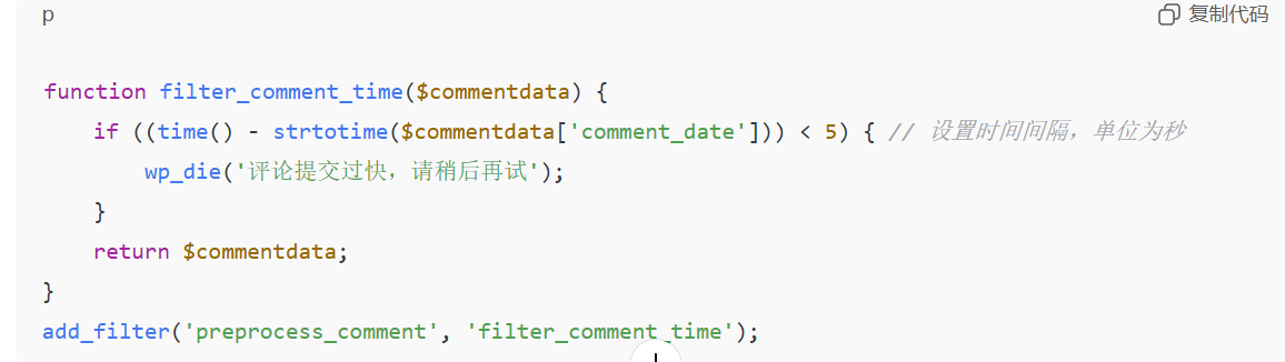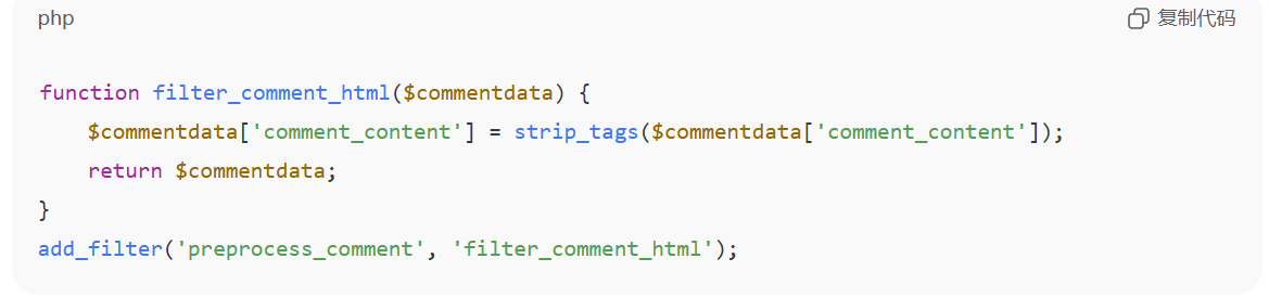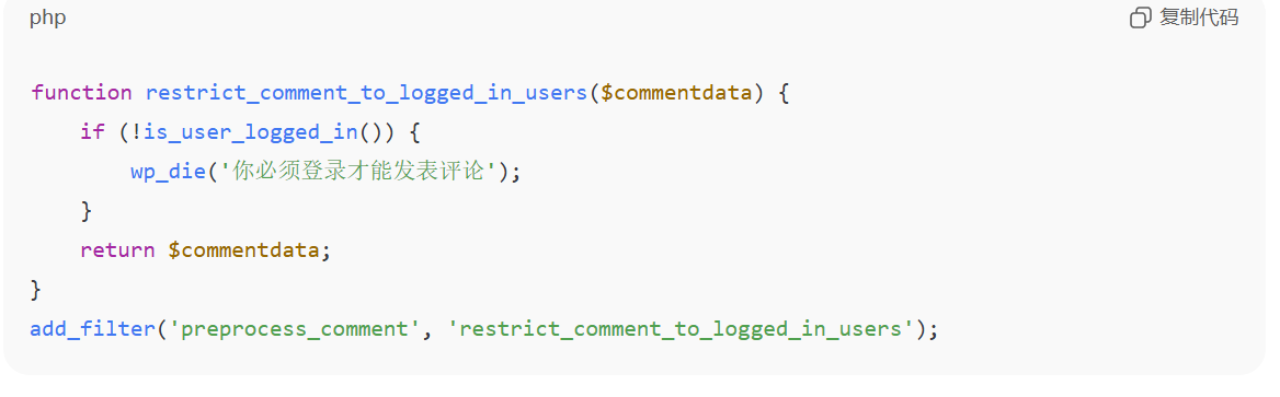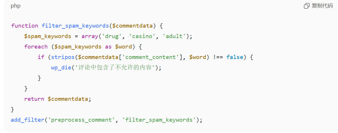 function add_hidden_comment_field($fields) { $fields['hidden_field'] = '<input type="text" name="hidden_field" value="" style="display:none" />'; return $fields;}add_filter('comment_form_default_fields', 'add_hidden_comment_field');function check_hidden_field($commentdata) { if (!empty($_POST['hidden_field'])) { wp_die('垃圾评论被检测到'); } return $commentdata;}add_filter('preprocess_comment', 'check_hidden_field');6.防止匿名