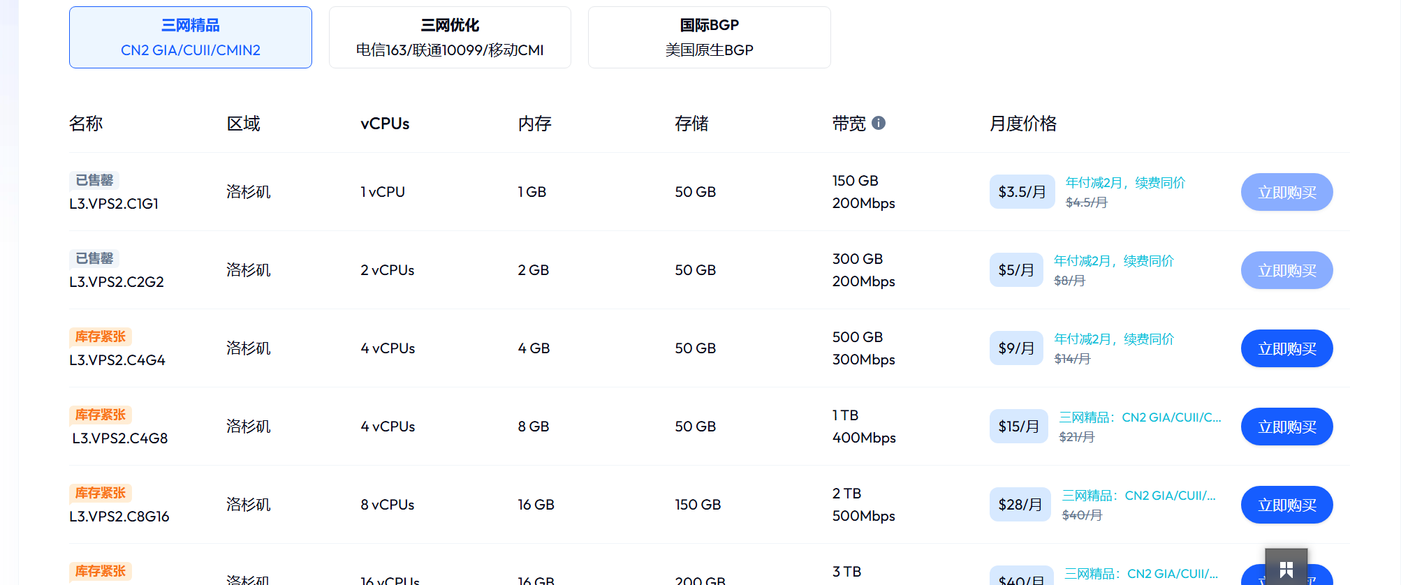 最低只要3.5$就可以享受三网精品。他家还有三网优化和国际BGP,满足各类人群的需求。定制裸金属满足中小企用户的使用需求,还可以定制CDN.他家现在所有的套餐都只有一个优惠包年优惠2个月。