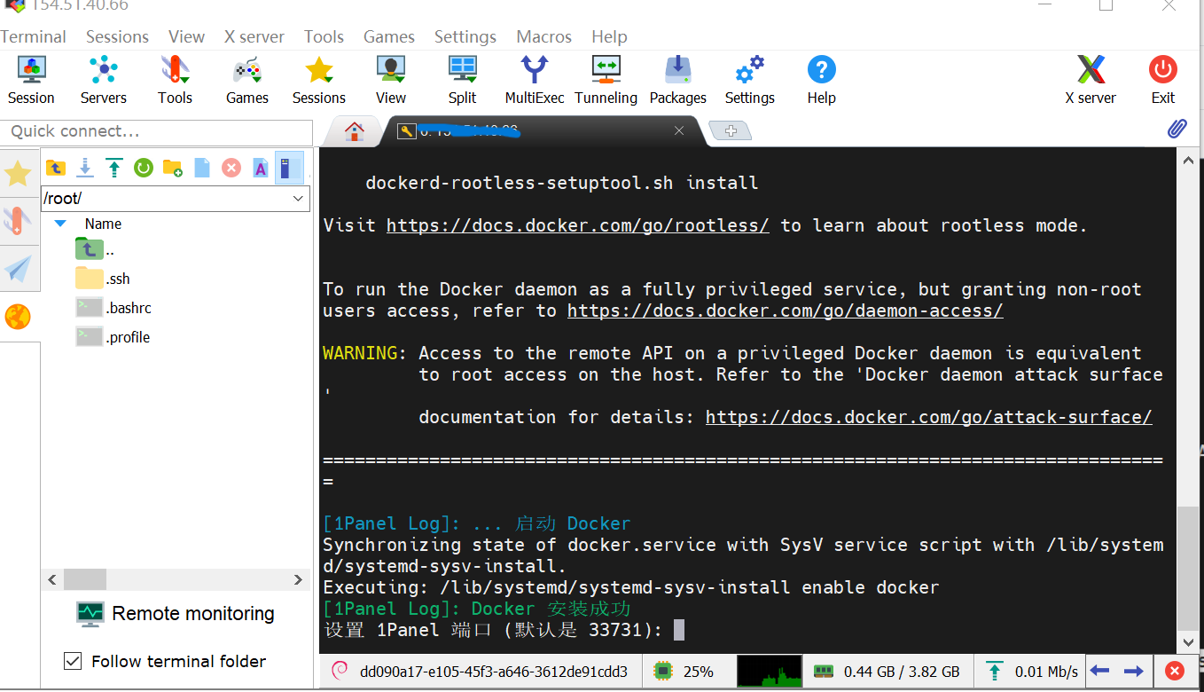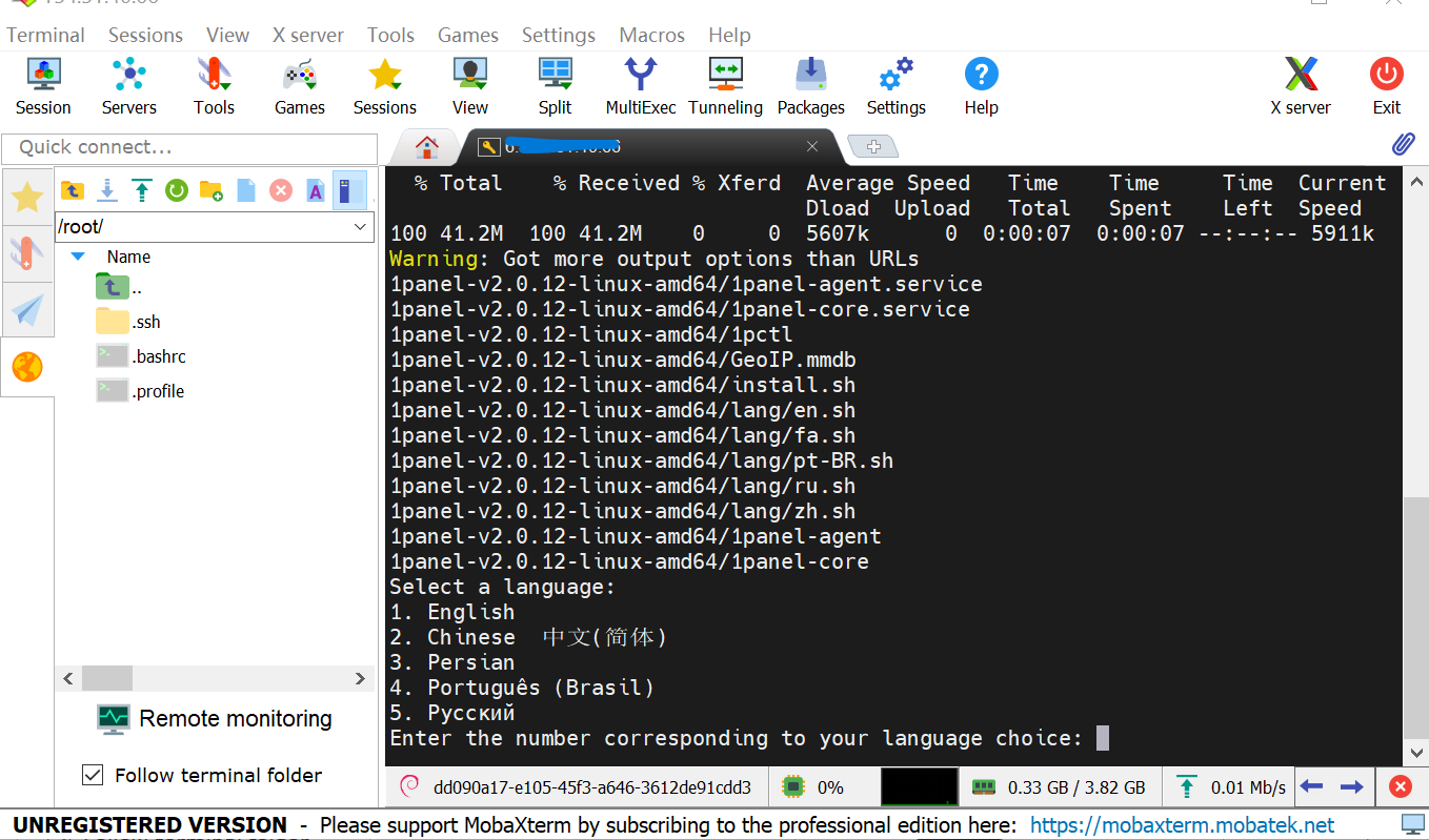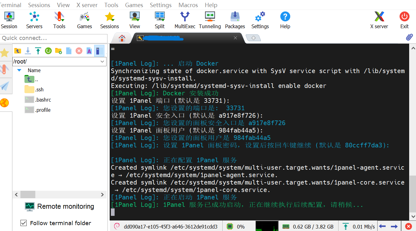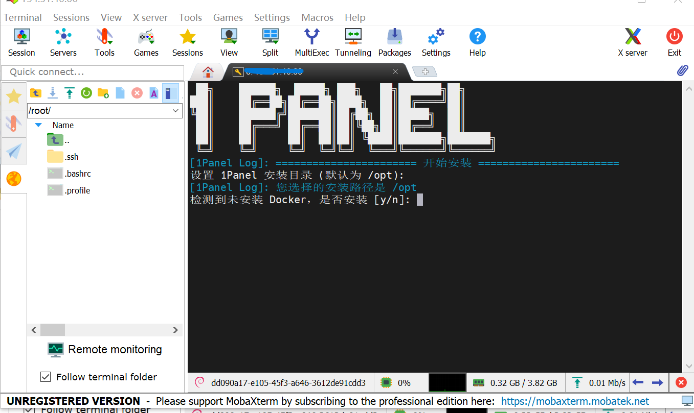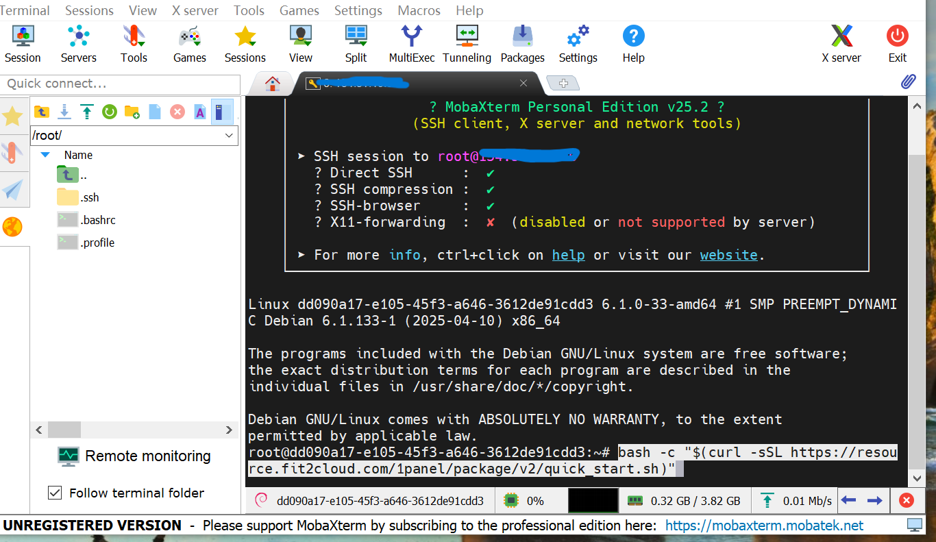 我们在选择1Panel一键安装脚本时一定要到官网,找到你服务器系统相对应的脚本复制到MobaXterm点击确认的可以。如下图